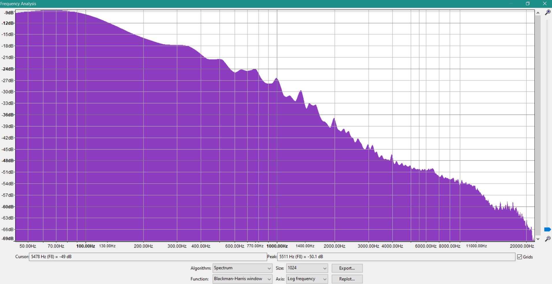 <font 11pt/Calibri,sans-serif;;inherit;;inherit>Na slikama 5. i 6. nalaze se spektrogram i spektar FLAC datoteke. S obzirom da je datoteka uzorkovana frekvencijom 44.1 kHz, prema Nyquistovom teoremu se filtriraju podaci niskopropusnim filtrom granične frekvencije 22050 Hz, te to vidimo i na grafovima. Ponekad lossless podaci mogu imati graničnu frekvenciju od 21.5 kHz ili postepeno smanjenje amplitude (engl. fade out) od 19 kHz prema višim frekvencijama.</font>