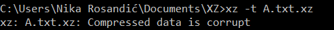Nakon malih izmjena u A.txt.xz datoteci korištenjem text editor-a, te ponovnog testa integriteta, rezultat je sljedeći: