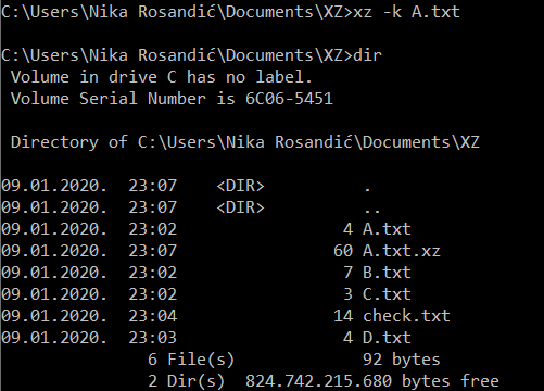 Ukoliko ne specificiramo zastavicu, stvara se komprimirana kopija datoteke u imedatoteke.ekstenzija.xz, a original se briše.