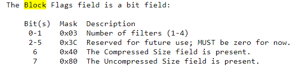 Samo zaglavlje bloka sastoji se od polja veličine zaglavlja bloka koja može biti u rasponu [0x01, 0xff], polja zastavica bloka, polja komprimirane (veličina komprimiranih podataka u bloku) i dekomprimirane veličine (veličina bloka nakon dekompresije) koji su dostupni samo ukoliko su prikladni bitovi zastavica postavljeni, polja liste zastavica filtera, polja ispune zaglavlja te CRC32 polja.