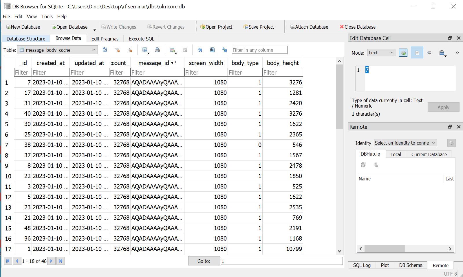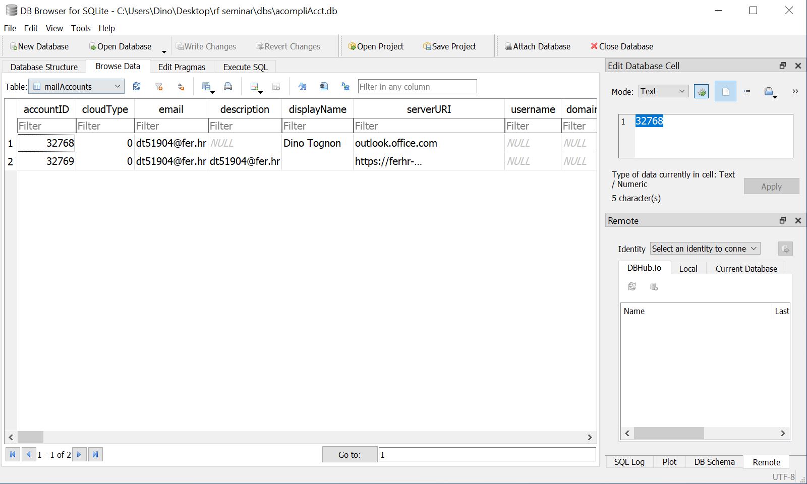 Aplikacija sadrži nekoliko baza podataka, slika ispod prikazuje sadržaj /databases direktorija. Baze podataka nisu sadržavale puno korisnih informacija, to je vjerojatno zbog toga što je aplikacija tek instalirana na uređaj i nije puno korištena. Za čitanje podataka iz datoteke baze podataka formata .db korišten je alat sqlitebroswer(www.sqlitebrowser.org). Najkorisnije baze podataka su ispale accompliAcct.db i olmcore.db koje jedine sadrže neke korisne podatke. Baza accompliAcct.db sadrži podatke o postojećim korisničkim računima zajedno s korisničkim postavkama. Sadržaj tablice mailAccounts je prikazan na slici ispod. Baza olmcore.db sadrži podatke o cache-iranim body dijelovima poruka e-pošte. Sadržaj njene tablice message_body_cache je prikazan na slici ispod. Za bolju kvalitetu slika kliknuti na sliku!