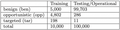 The table below shows the performance of large-scale/targeted attack classifier. Recall of documents designed for a targeted attack is also high, with false positives rate of 1%, which are very good results.