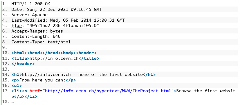 <font 10pt/Arial,sans-serif;;inherit;;inherit>In the example response numerical status code value 200 can be seen which represent successful transmission. Response headers further describe the session. After the empty line the body can be seen, it is HTML (Hypertext Markup Language) code used to display the Web page.</font>