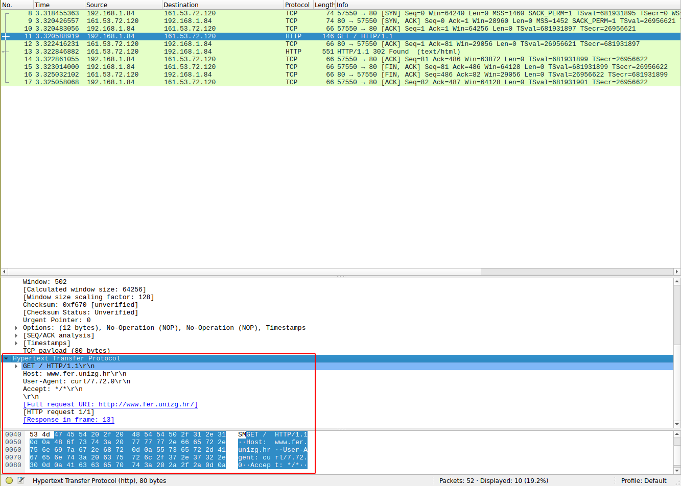 Slika 1. Uspostava veze kod pristupanja stranici http://www.fer.unizg.hr. Na slici je označen HTTP zahtjev koji se šalje nakon uspostave TCP veze. Zahtjev je poslan u čistom tekstu i bilo tko na mreži može čitati i mijenjati njegov sadržaj.