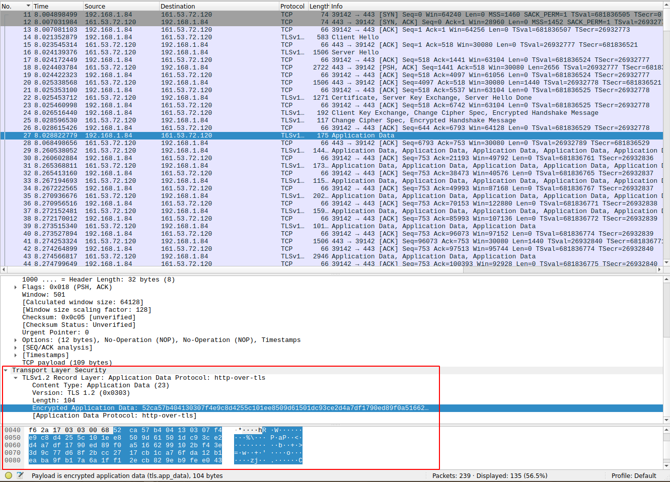 Računala i dalje komuniciraju koristeći protokol TCP. Razlika je u tome što podaci koje TCP prenosi pripadaju TLS-u, a ne izravno HTTP-u. Podaci protokola TLS sadrže isti onaj zahtjev koji bi se poslao da se koristio samo HTTP, ali enkriptiran sjedničkim ključem dogovorenim u koraku 2.III. Isto vrijedi za svu daljnju komunikaciju. Slika 2 prikazuje kako navedena procedura izgleda na mreži.