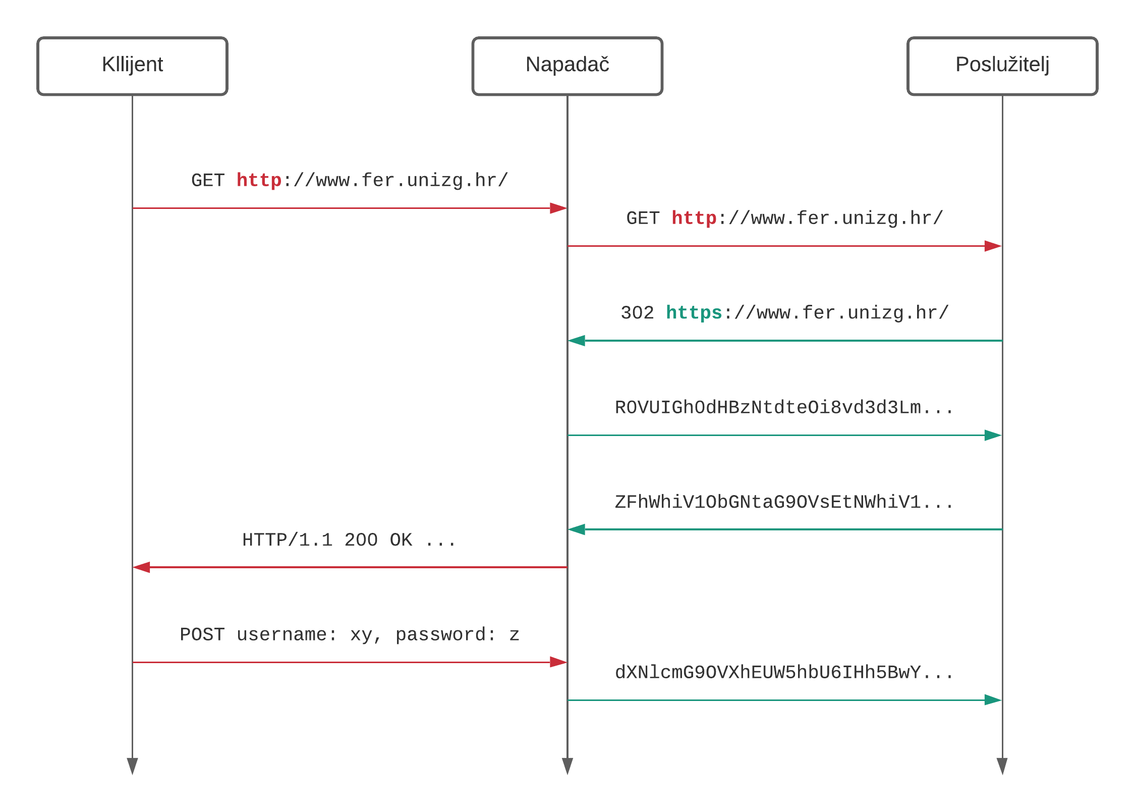 Slika 4. Prikaz napada SSL Strip. Napadač se postavlja između klijenta i poslužitelja. U trenutku kada bi klijent bio preusmjeren na HTTPS, napadač uspostavlja HTTPS vezu s poslužiteljem, a s klijentom komunicira nezaštićenom vezom.