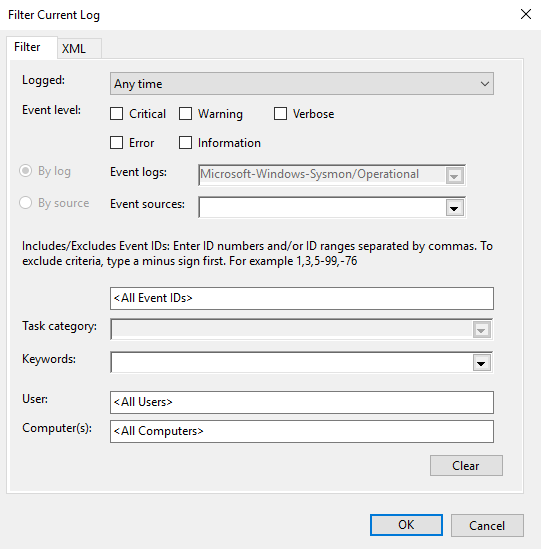 Windows Event Viewer dolazi s Windows operacijskim sustavom te ga nije potrebno dodatno podešavati i konfigurirati kako bi skupljao i nudio mogućnost analize logova. Nakon instalacije Sysmona, logovi će se bilježiti unutar Event Viewera te ih je moguće tamo analizirati. Analiza se najčešće radi filtriranjem logova prema zadanom event ID-ju ili pretragom po ključnim riječima. Slika 3 prikazuje kako izgledaju zabilježeni logovi u Event Vieweru. Budući da je obično zabilježena velika količina logova, potrebno ih je filtrirati ovisno o event ID-ju ili ključnim riječima kako bismo izdvojili samo logove koji su nam zanimljivi te iz kojih želimo izvući informacije potrebne za daljnju analizu. Možemo primijetiti da je ručna analiza logova s pomoću Event Viewera nešto zahtjevnija nego analiza upotrebom Splunka. Puno je jednostavnije pisati upite kojima filtriramo logove nego koristiti prozor za filtriranje koji nudi Event Viewer (Slika 4) te nam Splunk daje puno pregledniji pogled na filtrirane logove.
