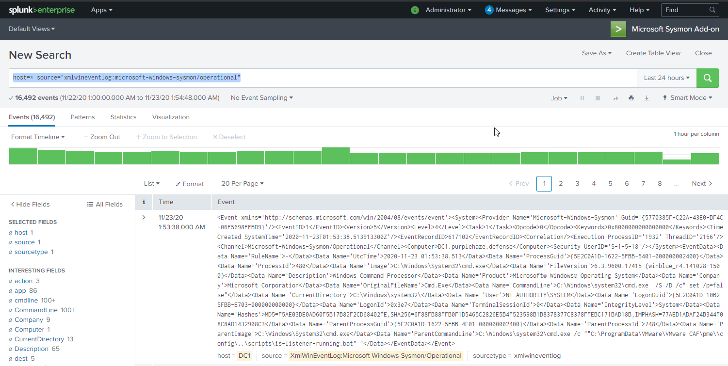 Slika 2. Primjer korištenja Splunka za analizu Sysmon logova [16]
