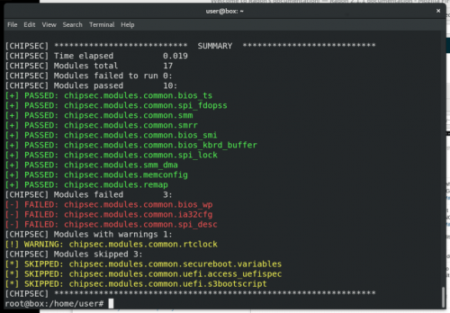Prikaz rezultata Chipsec analize (Linux terminal). Crvenom bojom su istaknuti testovi koji nisu prošli (FAILED), konkretno bios_wp (BIOS Write Protection) i spi_desc (zaštita Flash Descriptora). Ovi rezultati ukazuju na ranjivost sustava koja napadaču omogućuje trajno zapisivanje zlonamjernog koda u SPI flash memoriju.