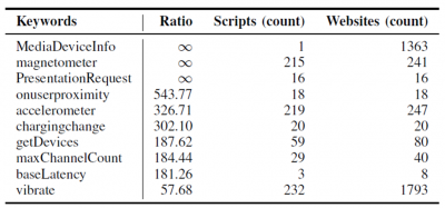 Moderne stranice još uvijek koriste JavaScript aplikacijska sučelja, metode i svojstva kako bi stvarali otiske korisnika. Autori rada u kojem je predstavljen alat FP-Inspector [4], namijenjen automatskom otkrivanju fingerprinting skripti, izdvajaju sljedeće elemente kao najpouzdanije pokazatelje da se na nekoj stranici provodi izrada otiska internetskog preglednika.