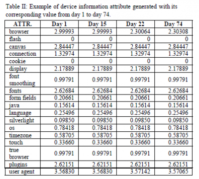Istraživači iz Manile koriste skup pravila za određivanje otiska, s ciljem praćenja kako se informacije o strojevima korisnika mijenjaju kroz vrijeme te pronalaženja konzistentnog načina za određivanje otiska. Definiraju stabilnost i raznolikost kao bitna svojstva za pravilan rad tehnika praćenja otiska korisnika, pri čemu stabilnost podrazumijeva da se otisci istog korisnika ne mijenjaju drastično kroz vrijeme, dok raznolikost pretpostavlja da će različiti korisnici imati dovoljno različite otiske kako bi se međusobno razlikovali. Te pretpostavke bi trebale biti istinite za dobre tehnike stvaranja otiska, ali navode da je kritična procjena jedinstvenosti otiska kako bi tehnika stvaranja otiska bila učinkovita. Prikupili su dobrovoljne sudionike te za svakog mjerili različite mjere otiska i njihove promjene kroz vrijeme, gdje pritom razlikuju automatizirane promjene, promjene koje korisnik učini mijenjanjem postavki te promjene prilikom događaja koje korisnik pokrene. Tijekom prikupljanja informacija o korisnicima izračunavaju entropiju za sve atribute. Zatim koriste algoritam za praćenje kojim provjeravaju jednakost značajki, računaju entropiju ima li skup podataka slične vrijednosti kao prikupljene te evaluiraju sličnost mjerenog preglednika s podacima iz skupa podataka. Na tablici priloženoj u radu jasno se vidi kako se dijelovi otiska mijenjaju dok određeni dijelovi ostaju konzistentni, te ideja iza praćenja istog korisnika sa djelomično promjenjivim informacijama.