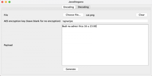 Na Slici 1 prikazana je kartica za enkodiranje poruke. U ovom dijelu aplikacije korisnik odabire izvornu datoteku u koju želi ugraditi skrivenu poruku, unosi proizvoljni ključ za šifriranje te upisuje tekstualni payload koji će biti skriven. Nakon potvrde, aplikacija šifrira poruku zadanim ključem i zatim je ugrađuje u novu datoteku primjenom odgovarajuće steganografske metode.
