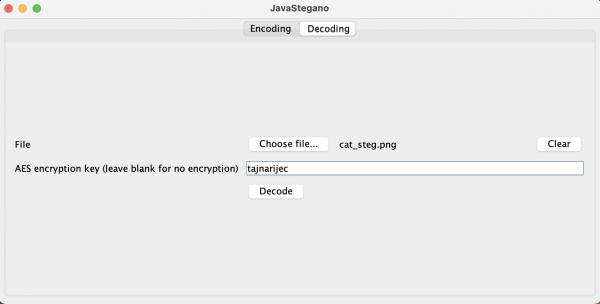 Slika 2 prikazuje karticu za dekodiranje poruke. Korisnik u ovom koraku odabire datoteku za koju pretpostavlja da sadrži skrivene podatke te unosi ključ za dešifriranje. Aplikacija potom iz datoteke izdvaja skrivene bitove, rekonstruira šifriranu poruku i pokušava je dešifrirati pomoću unesenog ključa.