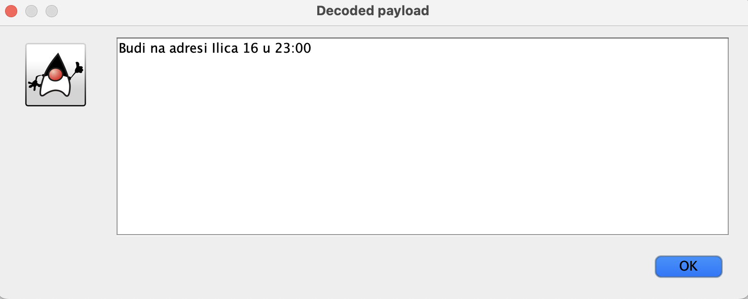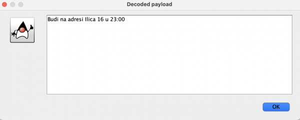 Slika 3 Prozor za uspješno dekodiranu poruku, prikazuje originalnu poruku