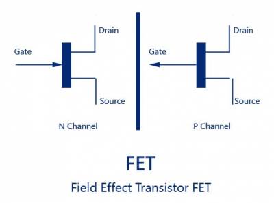 FET (engl. Field effect transistor) koristi se u poluvodičkim uređajima. On koristi električno polje da bi kontrolirao prolazak struju kroz poluvodič. Ima tri dijela: source, gate i drain. Struja ulazi u source, izlazi na drain, a između njih nalazi se gate. Kad se na gate dovede napon, stvori se električno polje. Ono mijenja vodljivost kanala, stoga se tranzistor može smatrati sklopkom. Njegova građa prikazana je na slici 1. [2]